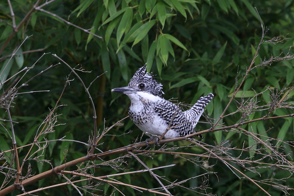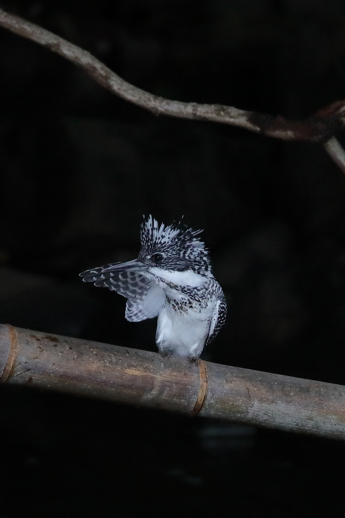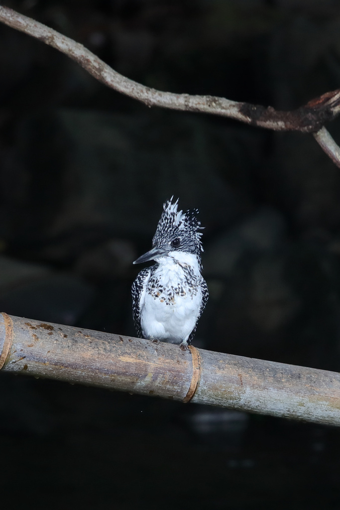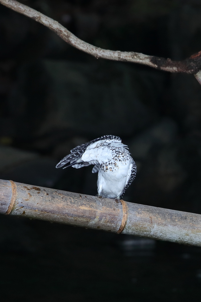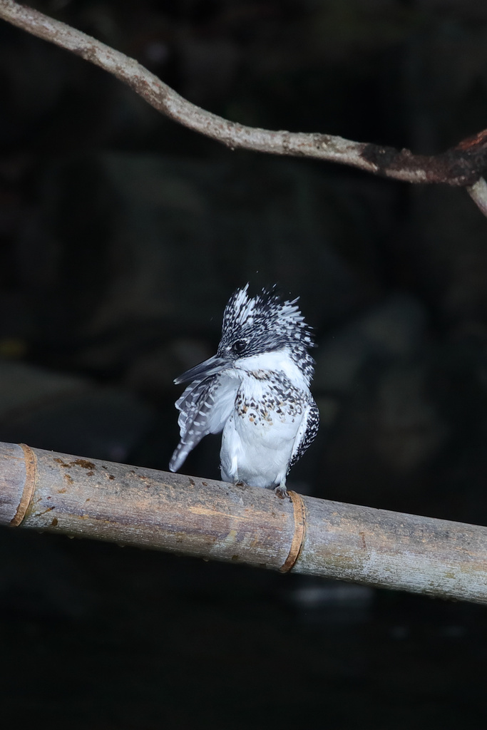 途中、釣り人が荒らしに来たのでダメかなと思っていましたが待ち続けること1時間以上、とうとうヤマセミが待ち構えていた目の前の枝に止まってくれました。