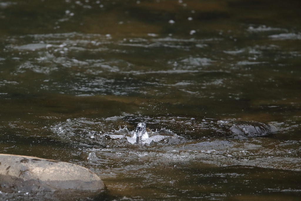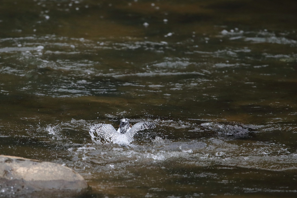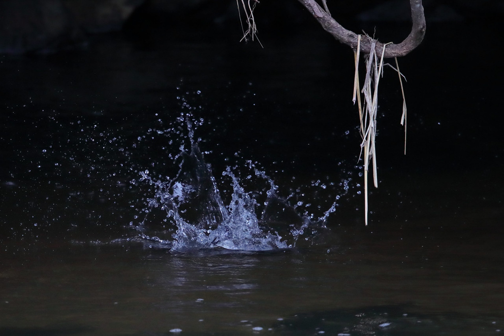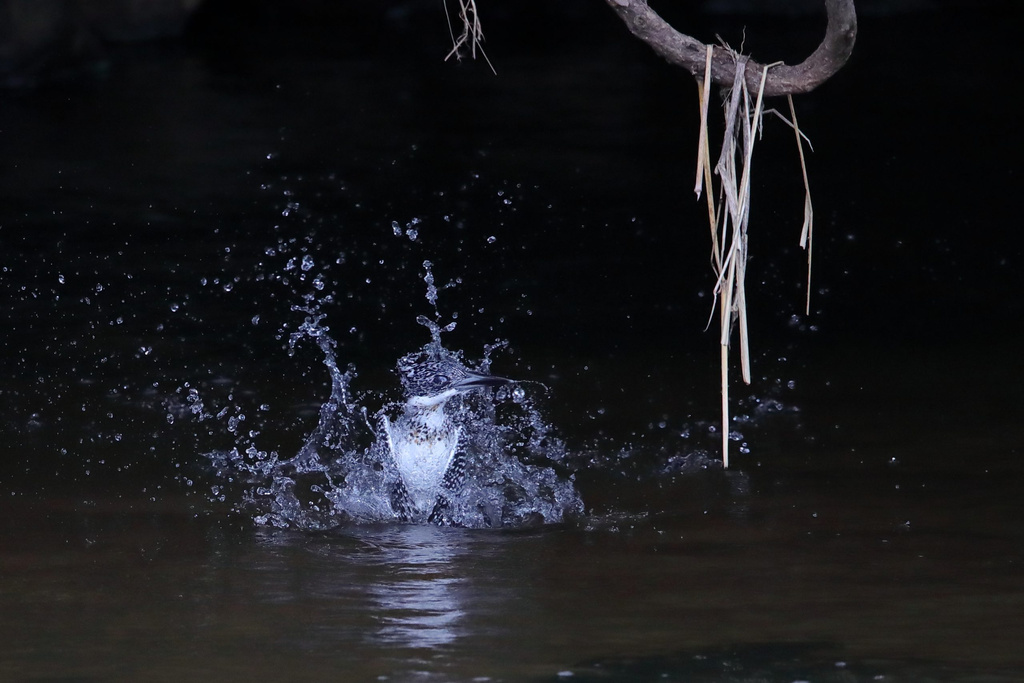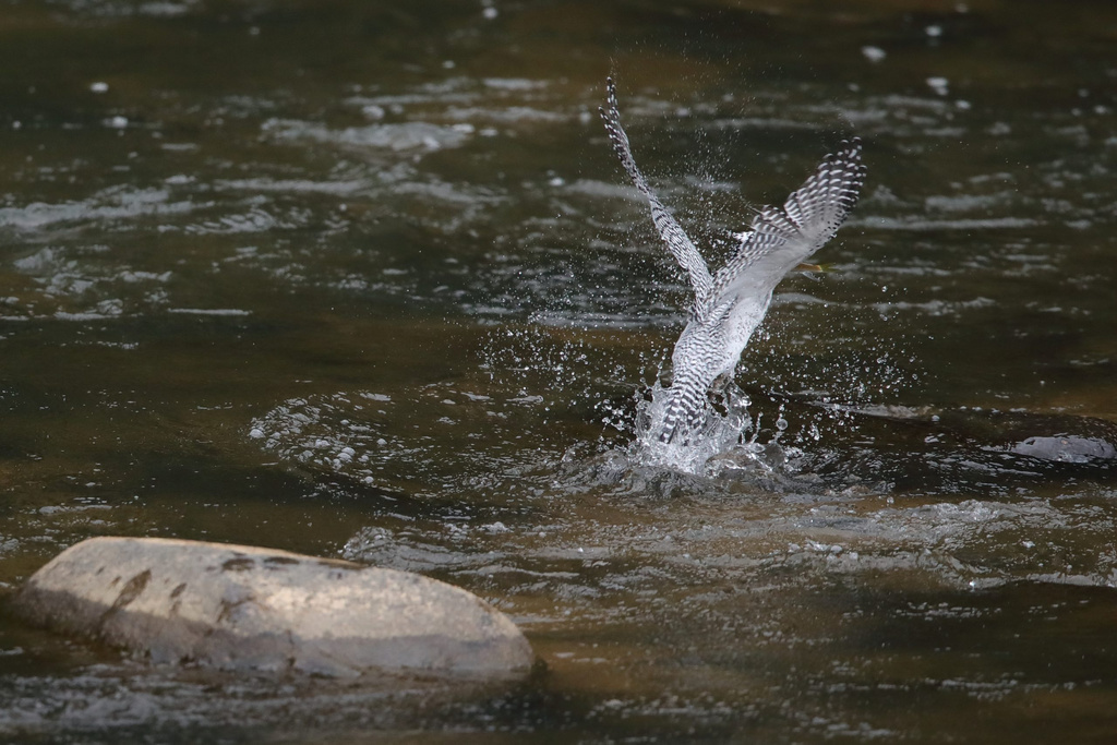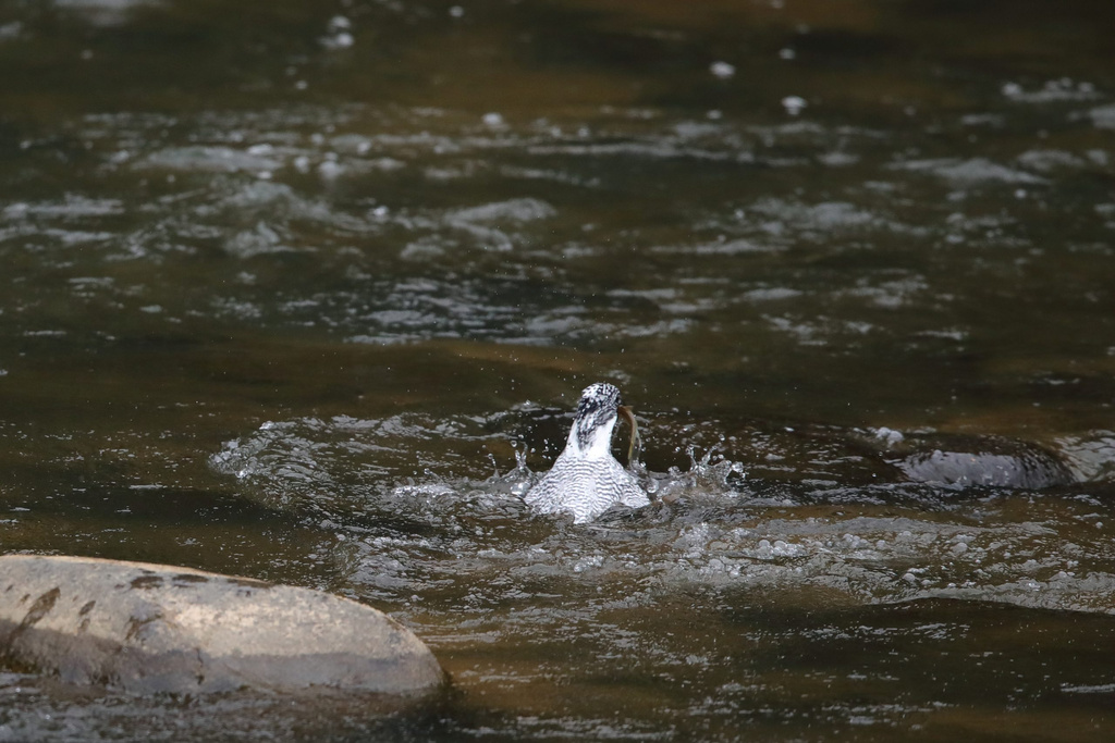あと、カワセミと違ってヤマセミは体が大きいのでドボン!って感じで少しスローで、普段カワセミを撮っている身としてはかなり笑えます。