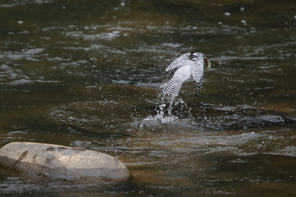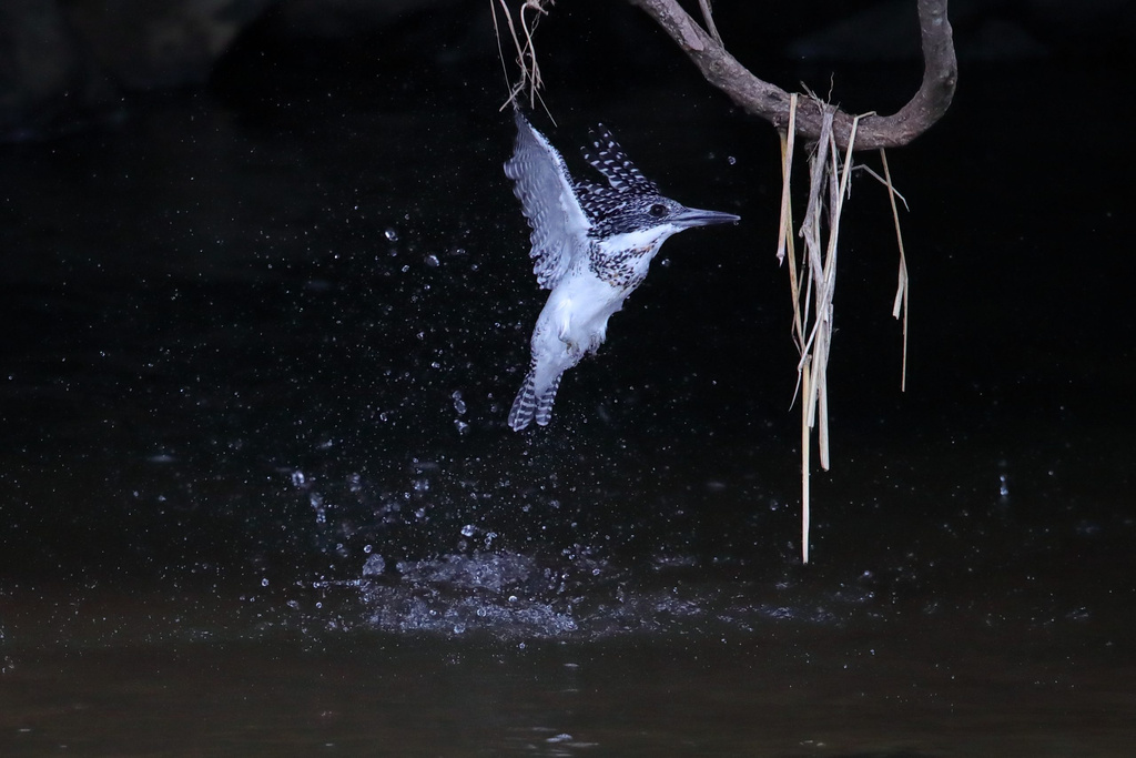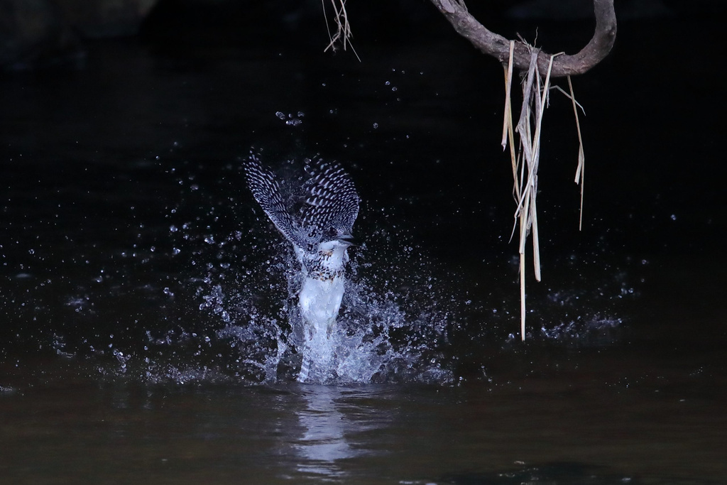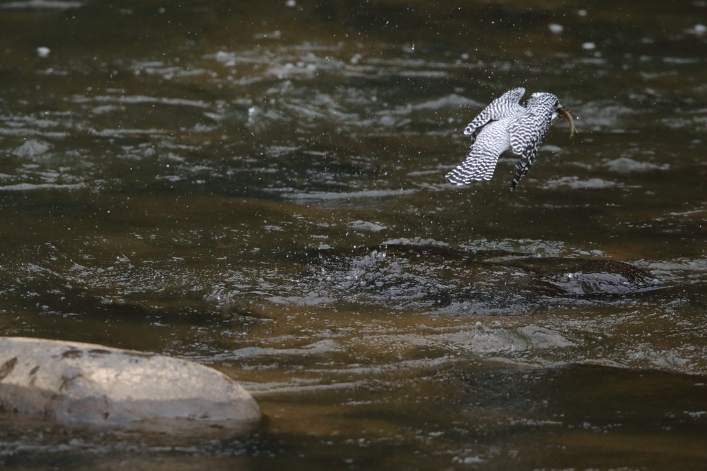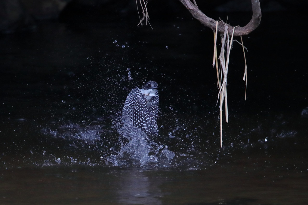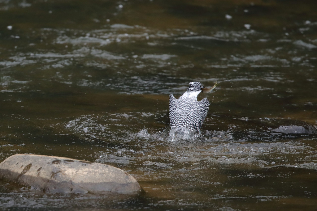 あと、カワセミと違ってヤマセミは体が大きいのでドボン!って感じで少しスローで、普段カワセミを撮っている身としてはかなり笑えます。