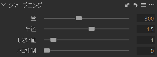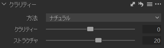 シャープニングに近いので私の場合はシャープニングとクラリティーでどれだけ明瞭/精細にするかを調整しています。