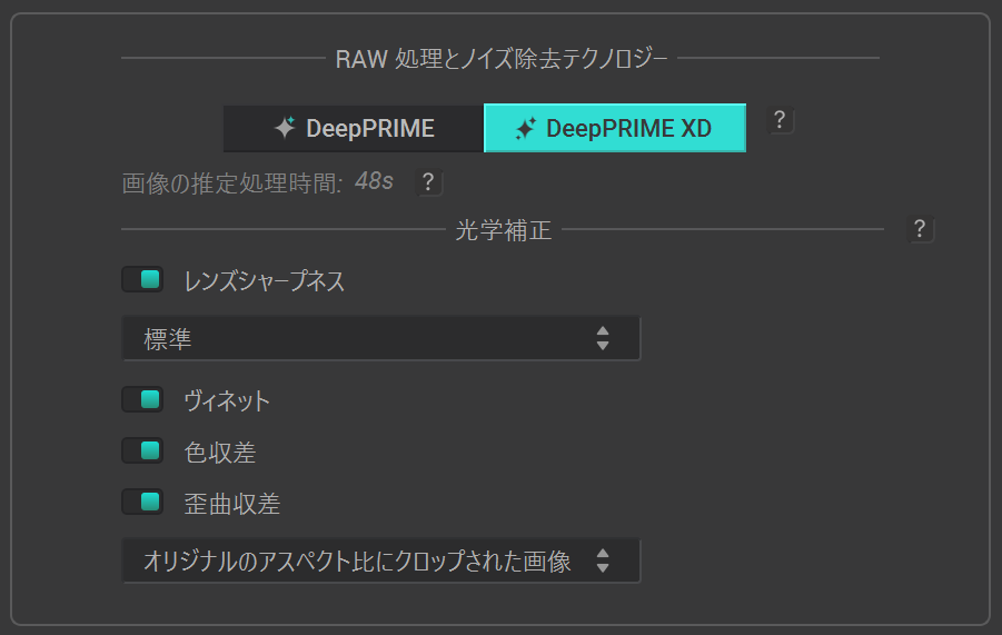 DxO PureRAW3にレンズ情報があれば、「シャープネス」「ヴィネット」「色収差」「歪曲収差」を補正してくれます。