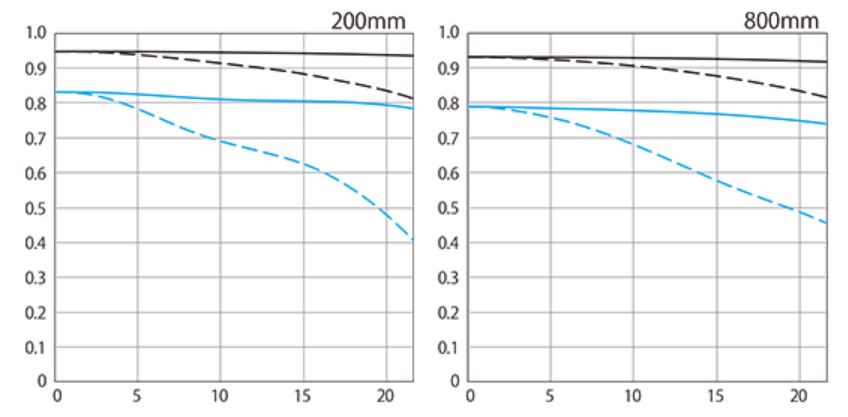 MTFをみただけでも800mmが少し甘いのはわかるのですが、この記事で気になる点は600mmまでは非常に良好という点ですね。