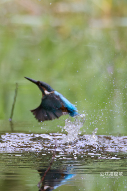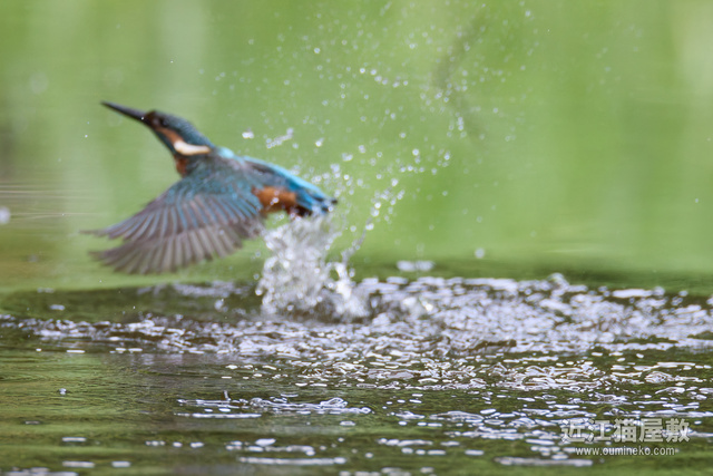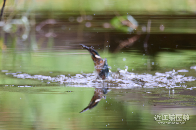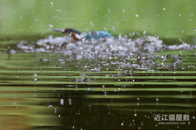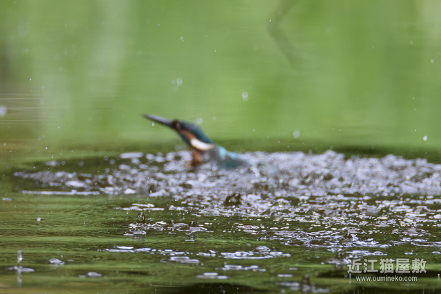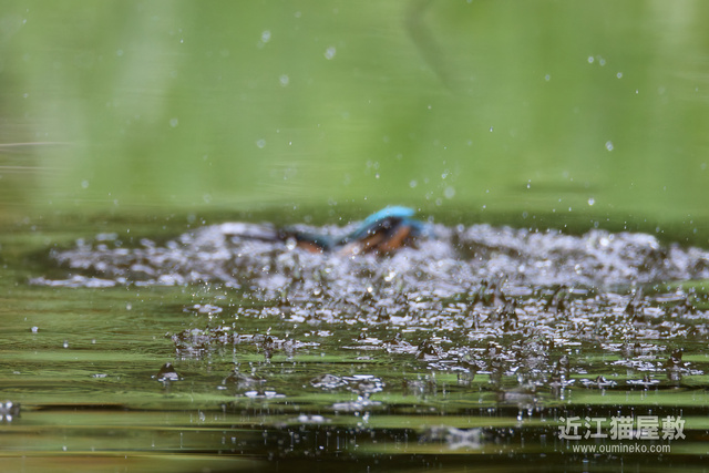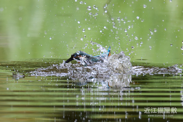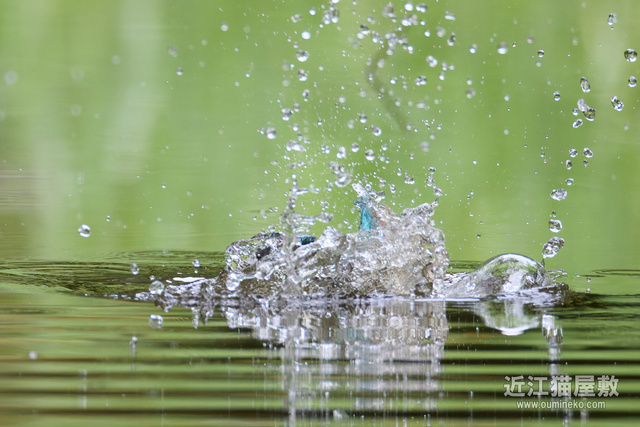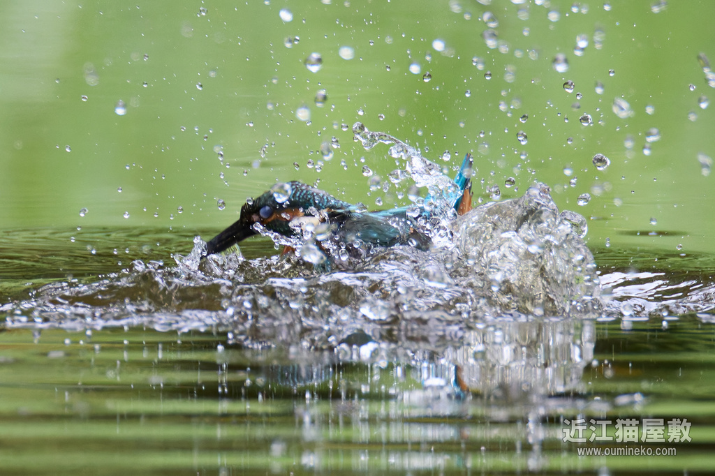 飛び込み予想位置の少し手前にピントを置いておいて、とびこんだあたりでシャッターを切ってるので、せめて水しぶきにピントが行ってほしいところですが水面ですね。