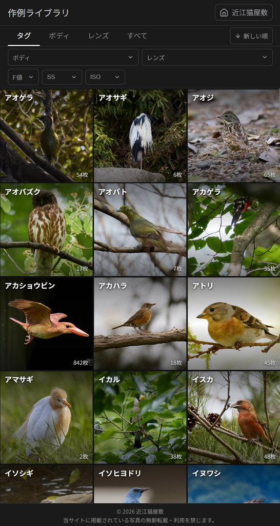 先日の新ブログシステム紹介でも書きましたが、ボディやレンズ、SSやF値、ISO、絞り値、鳥種などで絞って野鳥写真の作例を見ることができます。