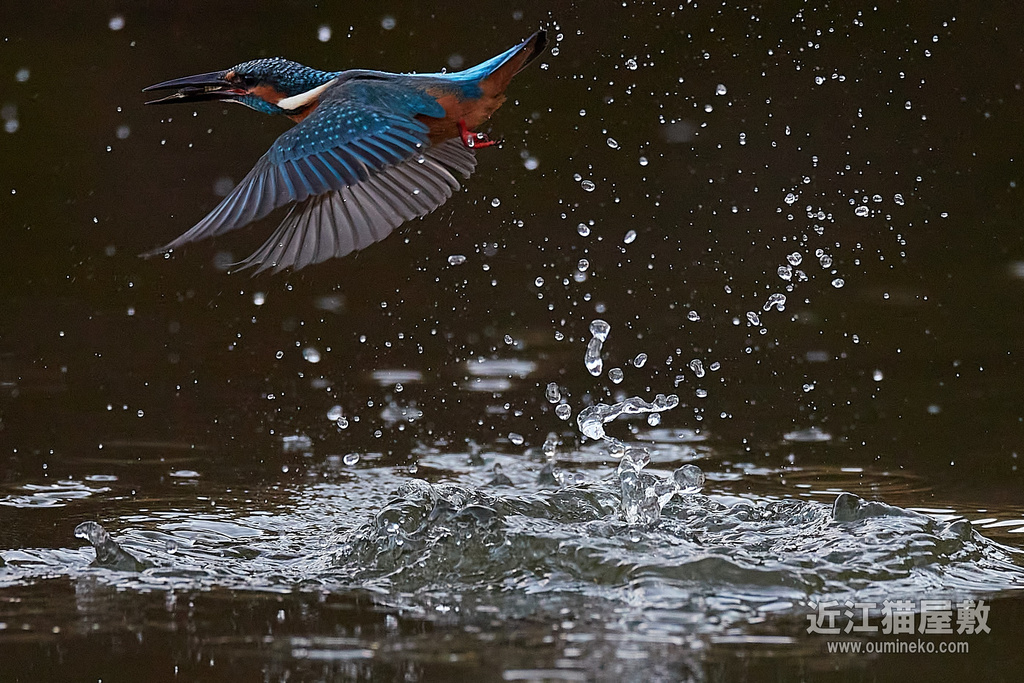 水しぶきがカワセミにまとわりついてるのも、雪のように舞ってるのも、水面に写る影もとても良いですね。