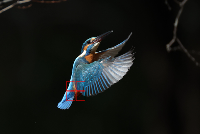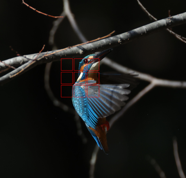 ガチピン連発でかつ枝が手前にあってうるさい状態でもカワセミ本体に合焦エリアがでていますので「EOS R3のAFが機能としてしっかり働いている」証拠です。