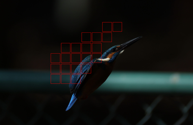 1コマ目では後ろのフェンスをとらえているのですが、3コマ目ではほぼカワセミに合って、それ以降はずっととらえています。